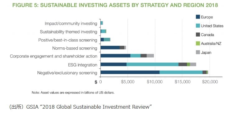 これを分類したGSIA(Global Sustainable Investment Alliance)によると、下記図表4のとおり、世界のESG投資資産額の最大はネガティブスクリーニング、ついでESGインテグレーションが多い。