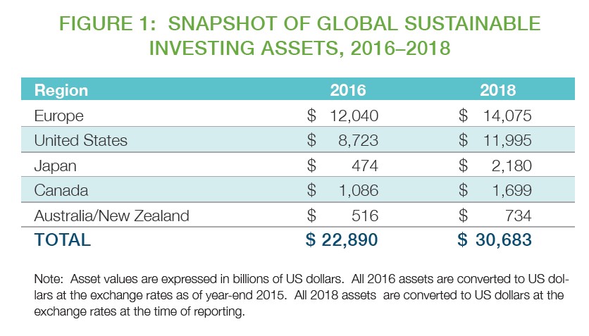 下記図表2を見ると、2016年は22,890ドル(約2,500兆円)がESG投資に関係する運用資産額で、その半分以上が欧州での運用額であった。2018年になると、その資産額は30,683ドル(約3,300兆円)と、2年で約35%の伸びを示している。日本でもまだ絶対額は少ないが、2018年には2,180ドル(約230兆円)と公的年金の投資を中心に、2年で約5倍となっている。東証の時価総額が約500兆円といわれているなかで、約230兆円というのはかなりの規模であるという見方もできる。