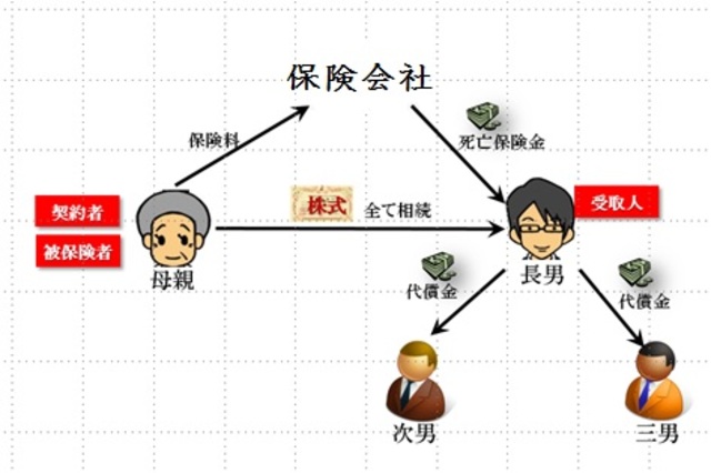 すなわち、大部分の相続財産を占める自社株式のすべてを後継者である長男に相続させる代わりに、非後継者である次男と三男には長男から代償金を支払うという方法である。その際、長男が支払う代償金の原資として生命保険の死亡保険金を活用するのである。これによって、遺産分割に伴う争いや遺留分の侵害を回避することが可能となる。相続財産が自社株式でなく不動産の場合であっても同様である。