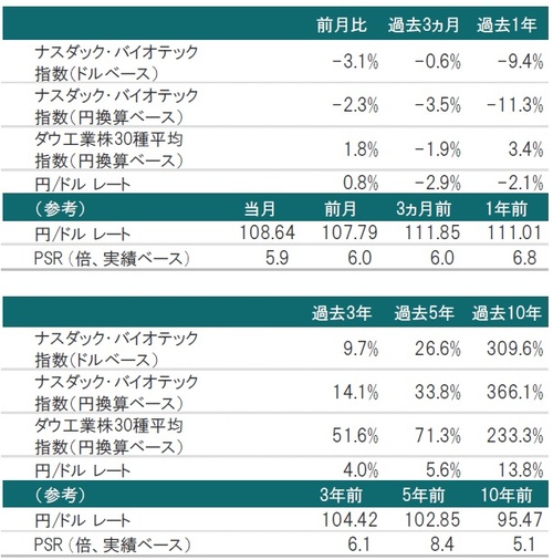 7月のナスダック・バイオテック指数(ドルベース、配当含まず)は下落しました。