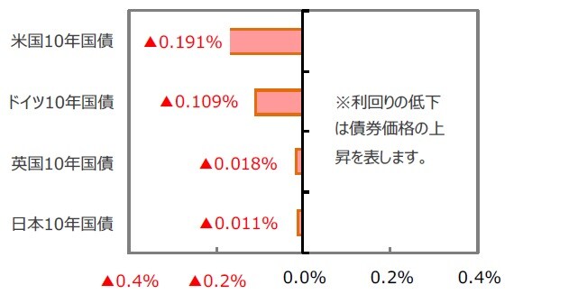 米国の10年国債利回りは、中国とドイツの経済指標の悪化などから世界的景気減速懸念が強まり、0.191%低下しました。ドイツ、英国、日本10年国債利回りも同様の理由で低下しました。