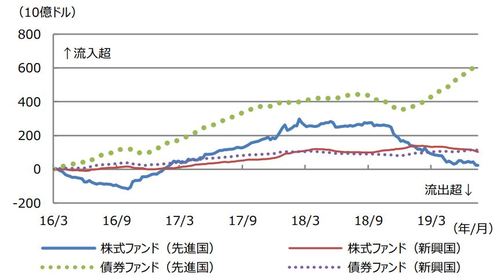以上より、グローバル投資マネーの行き先は、株式ファンドから債券ファンドに移っていることが分かります。この動きは特に先進国において、「欧州株ファンドの大幅な流出超」、「北米債券ファンドの大幅な流入超」という形で、顕著にみられます。米中貿易摩擦問題の再燃などから、世界景気の先行き不透明感が強まっていますが、現時点ではまだ、新興国市場全体から投資マネーが流出する状況には至っていないとみられます。