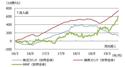 昨年末以降、株式ファンドの資金流入額は減少傾向にあり、債券ファンドの資金流入額は増加傾向にあります(図表1)。また、株式投資の待機資金とされるMMF(マネー・マネージメント・ファンド)は、トランプ米大統領が、2,000億ドル分の中国製品に対する制裁関税の税率引き上げを表明した今年5月以降、資金流入額が急増しています。やはり、投資信託のマネーフローにも、より安全な資産を求める動きがみられます。