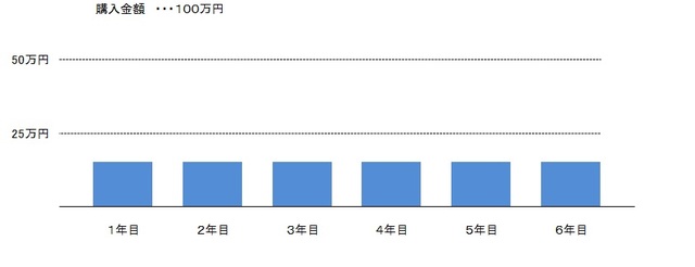 たとえば、100万円の資産で耐用年数が6年の場合、各年度の減価償却費の計上額は、以下のようなイメージになります。