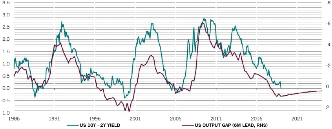 典型的な動きとしては、米国の10年国債と2年国債の利回りの逆転で、逆転した約1年後に景気後退局面となっています。なぜならば、国債のイールドカーブというものは生産ギャップと密接に相関しているからです。この生産ギャップとは、現在の経済成長率と長期的な潜在成長率の差を示しています(図表2をご参照ください)。