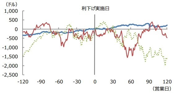 一方、①、④、⑤の利下げ期間は比較的長く、順に約3年3カ月、約2年半、約1年3カ月でした。また、各期間で米国は景気後退に陥り、①では1990年7月から、④では2001年3月から、⑤では2007年12月から、それぞれ景気後退局面入りしました。なお、①について、ダウ工業株30種平均は利下げ開始前後で堅調な推移が続きましたが(図表2)、その後の米景気後退入りで下げに転じ、日経平均株価もおおむね同じ動きとなりました。