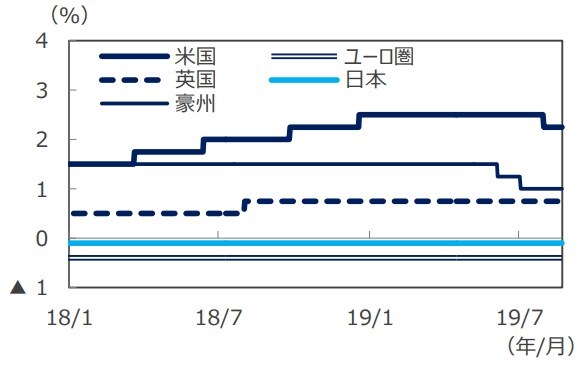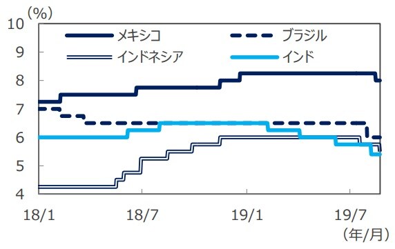 ■足元では、各国・地域が相次いで利下げに踏み切っており、「利下げドミノ」とも呼べる状況になっています。7~8月(22日まで)は、米国や豪州、ブラジル、メキシコ、インドなどが利下げを実施しました。