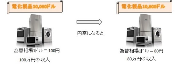 一方、輸出業の場合、10,000ドルの電化製品を輸出販売する際、1ドル=100円だと100万円の収入ですが、1ドル=80円になると、80万円の収入になります。そのため、円高になると輸出業は利益率が下がってしまいます(あくまで外貨建で取引をしている場合に限ります)。