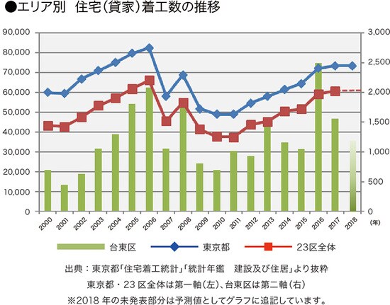 エリア別に貸家の住宅着工数(図表9)を見ると、東京都と23区の各年の増減は相関していることがグラフから読み取ることができます。台東区の供給傾向も東京都や 23区の増減と似たような動きを見せおり、2000年頃から着工数の増加し、2006年以降は低い水準で抑えられていることがわかります。2009年以降はまた増加傾向が伺えますが、2016年以降は増加傾向が抑えられており徐々に減少サイクルに入ると予測されます。蔵前においては開発余地がまだ残っているエリアですので、今後の供給動向には注意が必要です。