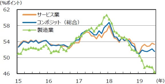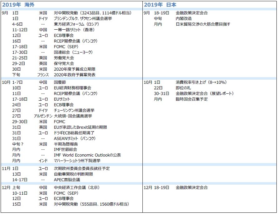 今後の注目点は、米国の雇用・消費の耐久力である。通商摩擦による製造業の景況感悪化に対し米国のサービス業の雇用が抵抗力を示し、世界経済の約2割に達する米消費が崩れなければ、世界経済の底割れは回避できるとみられる。米国の失業保険請求件数や非製造業の景況感に関する指標が注目される。