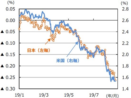 • ECBは7月25日の理事会で、政策金利を据え置いた。フォワードガイダンス(先行きの金融政策の指針)において、「少なくとも2020年前半まで政策金利は現状か、“より低い水準”を予想する」と明言し、利下げを示唆した。加えて、18年12月に打ち切った量的緩和策の資産購入プログラム(QE)を再開する可能性についても触れた。