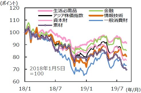 • 今後は時価総額の約13%を占め、国別では中国が約66%を占める「一般消費財」の改善が待たれる。中国では小売売上高の伸び率が鈍化しており、消費に力強さが不足している。ただ、中国は所得減税など内需を刺激する景気対策等を行っている。年後半にかけて中国の景気が回復し、「一般消費財」の業績と株価が改善すれば、アジア株式市場も堅調さを取り戻すと期待される。