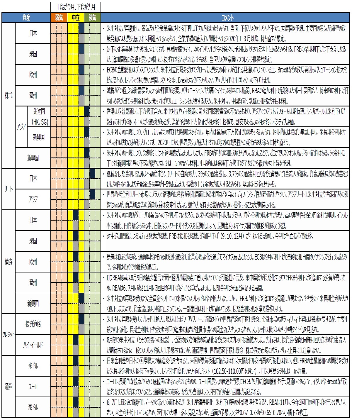 • 日本株式市場は、米中貿易摩擦が再び激化したことによって、景気及び企業業績に対する下押し圧力が強まったと想定される。当面は下値リスクをはらんだ不安定な展開が予想される。景気サイクル及び企業業績の底打ちの時期は、今年の秋ごろと想定していたが、来年1-3月に後ずれするとの見通しに変更した。