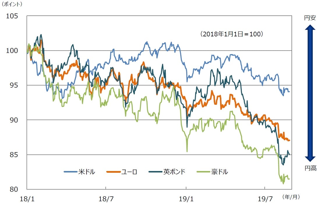 • ユーロは長期的な観点からみて底値圏にあるとみられるものの、ユーロ圏景気の低迷を背景にECBが9月に追加緩和を行う見通しであること、イタリアやBrexitなど政治的なリスクが高まっていること、通商摩擦の継続、などから、当面はレンジ内で上値の重い展開が予想される。