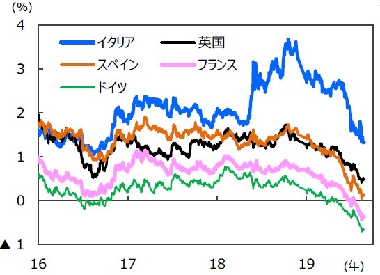 • 景気、物価が弱い上、FRBが利下げに転換し、また、為替の面からも、ECBが追随する必要性が高まっている。2019年9月に0.2%の利下げと債券購入の再開を決定(実施は2020年初)すると予想する。