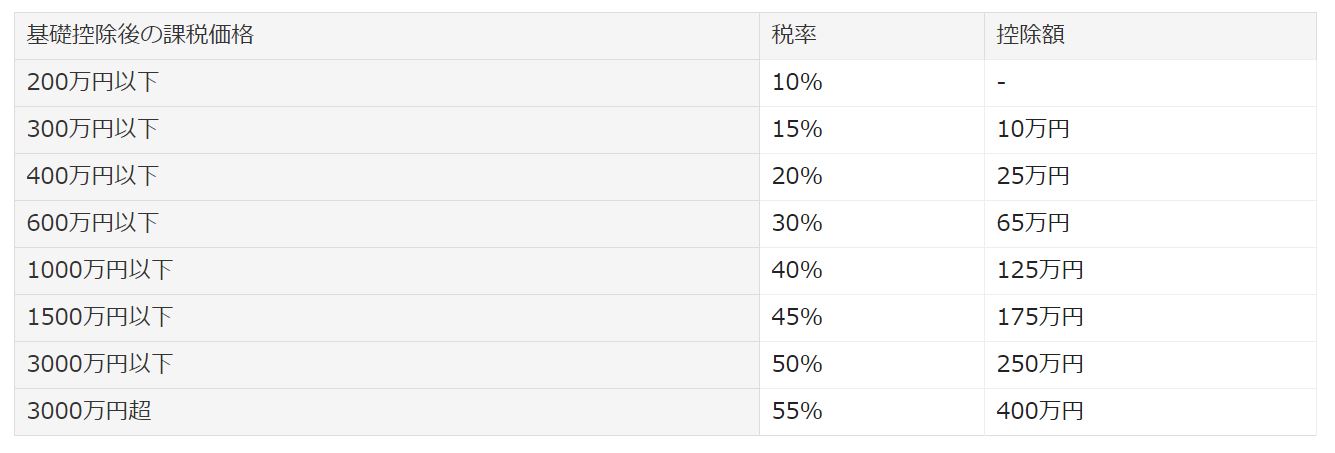 生前贈与は3,000万円を超えた場合、なんと55%と非常に高い税率となっているため、現金の準備も必要であること認識しておきましょう。
