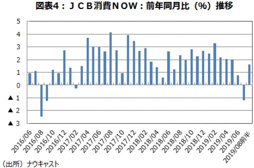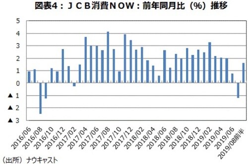 ナウキャストのJCB消費NOWの前年同月比は、7月が▲1.190%と17年2月の▲0.278%以来2年5カ月ぶりのマイナスになったが、気温が上昇し夏物商品が売れた8月前半は+1.603%とプラスに転じた(図表4)。また、主要百貨店大手5社の8月売上高(既存店ベース、速報値)は三越伊勢丹、高島屋、そごう・西武、阪急阪神百貨店の4社が前年同月比増加となった。台風や大雨で一時的に営業時間を短縮する店舗があったが、消費税引き上げ前で宝飾品などの高額品が堅調、また気温の上昇で夏物衣料品や雑貨の売上高が良かったようだ(図表5)。
