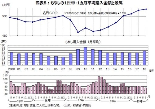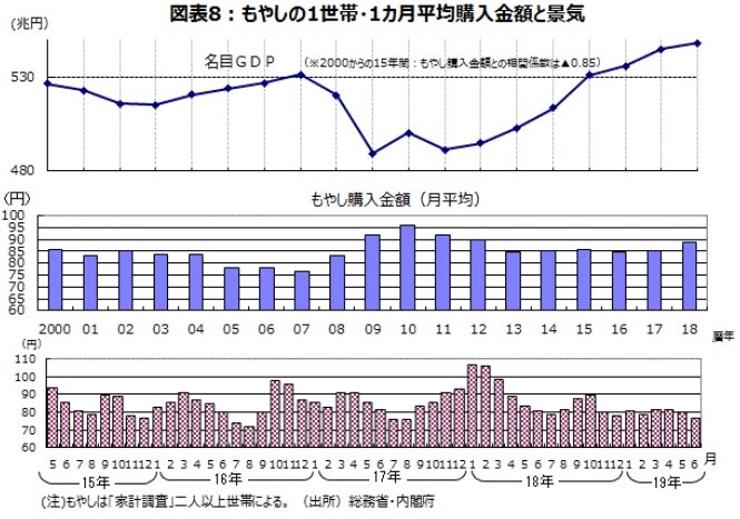 東京23区清掃一部事務組合の1作業日当たり粗大ゴミの前年同月比は18年11月から19年7月まで9カ月連続増加している。09年から11年頃に実施されたエコポイントの活用により購入されたテレビは平均使用年数(19年3月調査)の9.7年を迎え、買い替えが出ていることを示唆していよう。金融機関の店舗強盗件数は7月20日までで6件と18年同時期の12件の半分にとどまっている。17年は26件、18年は17件だったが、19年はさらに減少が見込まれる状況である。不況期や野菜の値段が高い時期に購入が増えるもやしの1カ月の購入金額は、直近のデータである19年6月の家計調査で77円と18年6月の81円を下回っている(図表8)。