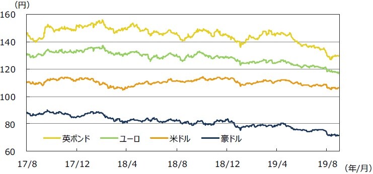 円は米ドル、ユーロ、ポンド、豪ドルなどに対し上昇しました。米国が、対中追加関税措置を更に拡大する方針に転じ、米中互いに報復関税をかけ合うなど米中対立の一段の高まりからリスク回避の流れとなり、円が買われました。また、世界経済減速への懸念から、FRBやECB、豪州準備銀行(RBA)など主要中銀による利下げ観測が高まったことなども円買いの要因となりました。英ポンドは合意なきEU離脱に対する懸念などが嫌気されました。