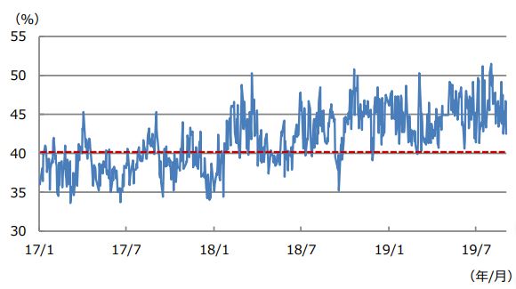 次に、空売り比率を確認します。空売り比率は一般に40%を超えると株価の底入れは近いと解釈されます。しかしながら、空売り比率の40%超えは3月5日から9月5日まで124営業日連続となり、データを取得できる2008年10月16日以降で最長です。ただ、40%超えは昨年末からほぼ定常化しており(図表2)、下げ相場に収益機会を見込む投資家が極めて多いことを示唆しています。