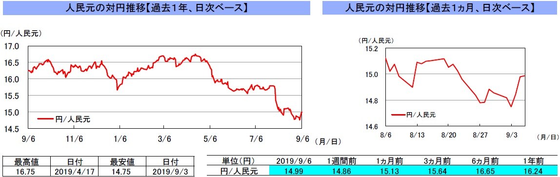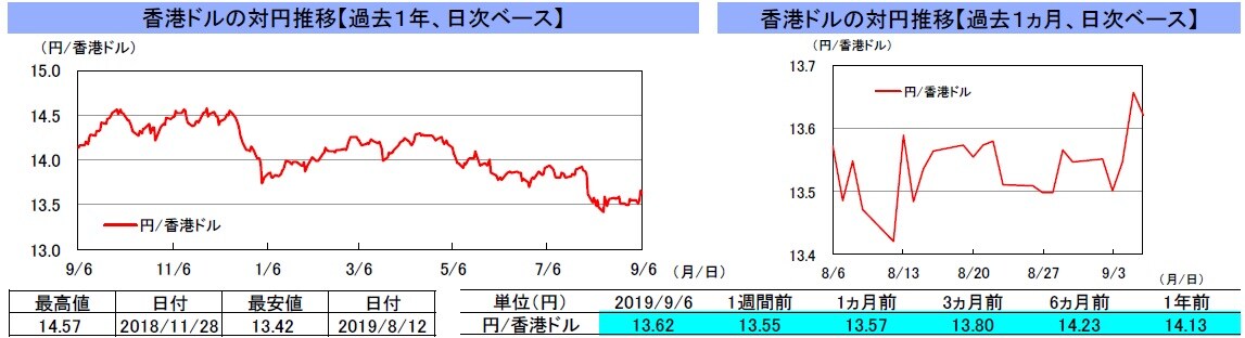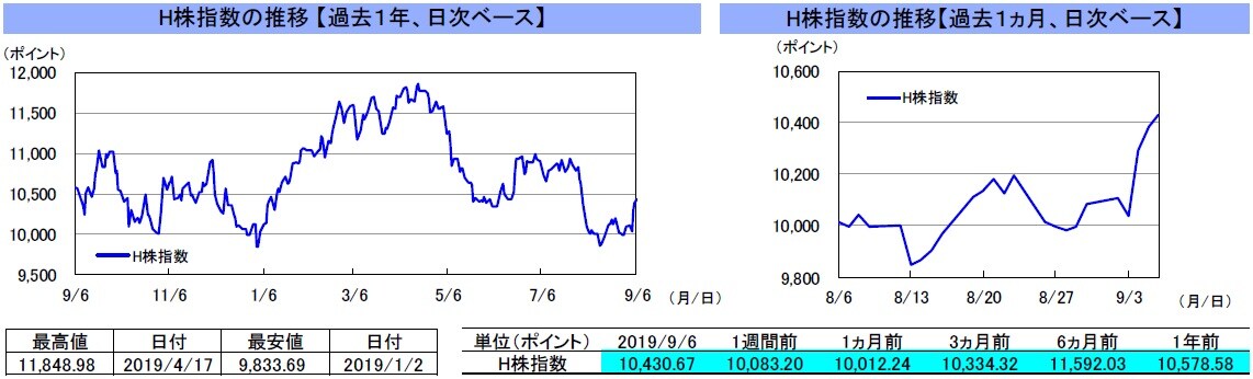 先週の中国本土市場は、上海総合指数が前週末比+3.9%、深セン総合指数が+5.0%と上昇しました。先週は、中国政府が預金準備率を引き下げる方針を示したことや、米中の閣僚級協議が10月初旬に開催されると報じられたことなどを好感して、株価は上昇しました。香港市場は、H株指数が前週末比+3.4%、レッドチップ指数が+1.8%と上昇しました。先週は、中国の預金準備率の引き下げ期待や米中の閣僚級協議の10月開催報道に加え、香港政府が「逃亡犯条例」改正案の撤回を正式に表明したことなどを好感して、株価は上昇しました。