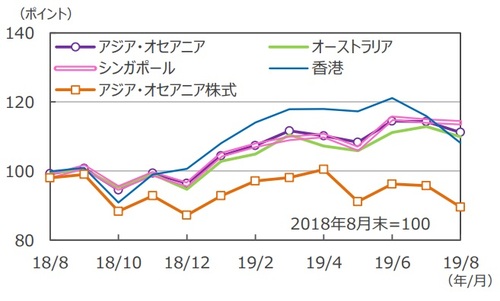 ■8月末時点のアジア・オセアニアのリート市場は、現地通貨ベースでシンガポールが前月比+1.6%、オーストラリアが同+1.3%と上昇しました。8月は米中が互いに報復関税をかけ合うなど対立が一段と激しさを増し、株式市場が調整する中で、リートのディフェンシブ性が好感されて2市場は堅調に推移しました。一方、香港は長引くデモによる経済への悪影響などが嫌気されて同▲4.6%となりました。