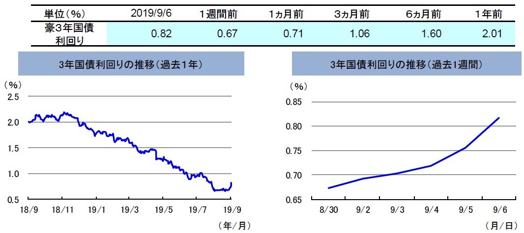 先週の豪州の3年国債利回りは、上昇しました。先週は、10月の利下げ観測の後退や米中の閣僚級協議の10月開催報道などから、豪州の3年国債利回りは上昇(債券価格は下落)しました。