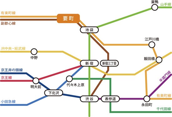 「要町」駅は有楽町線、副都心線の2駅が通っており、ターミナル駅の「池袋」から1駅のところにあります。池袋を起点に西は両路線とも和光(埼玉県)まで並走しており、池袋から有楽町線は東京の東側へ、副都心線は渋谷を通って直通東横線で神奈川方面までを結びます。