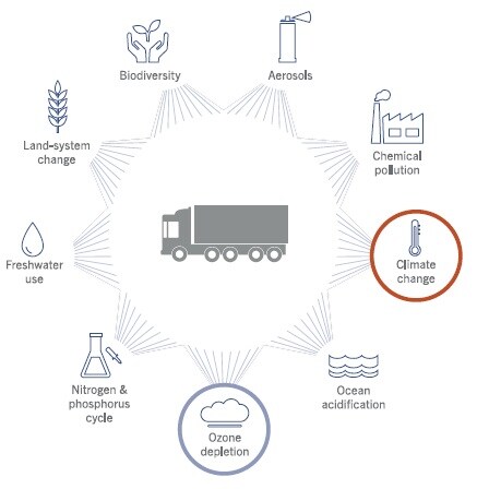 しかしながら、オゾン層を破壊する物質の排出量については、運送業は持続可能な限界値の範囲内となっています。