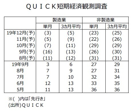 ●9月11日に発表されたQUICK短観9月調査の調査期間は8月28日から9月8日である。製造業DIは6月調査の+12から9ポイント低い+3になった。13年3月の▲1以来6年半ぶりの低水準になった。また、非製造業DIは6月調査の+33から6ポイント低下の+27となった。