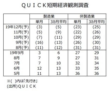 ●QUICK短観9月調査の製造業の12月までの「先行き見通し」は+3で9月実績の+3と同じである、非製造業の12月までの「先行き見通し」は+23で9月実績の+27から4ポイントの悪化予想である。非製造業の悪化は、10月に消費税率が引き上げられることを反映していよう。