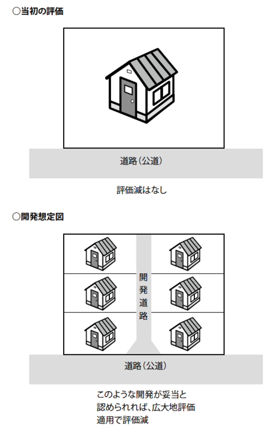 筆者が実際に関わったケースでも、資産税に詳しくない税理士が扱ったために不備が多く、広大地という大きな評価減の要素が漏れていたことがありました。下記の図表2のとおり、本来は開発想定図のように考えることができるので、広大地評価として45%の評価減ができたのですが、適用されていなかったのです。