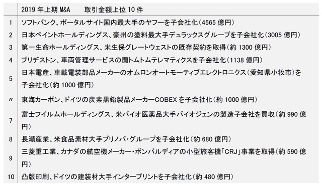 上期の取引金額トップはポータルサイト国内最大手、ヤフーの子会社化を5月に発表したソフトバンク。日本ペイントホールディングス、第一生命ホールディングスがこれに続いた。