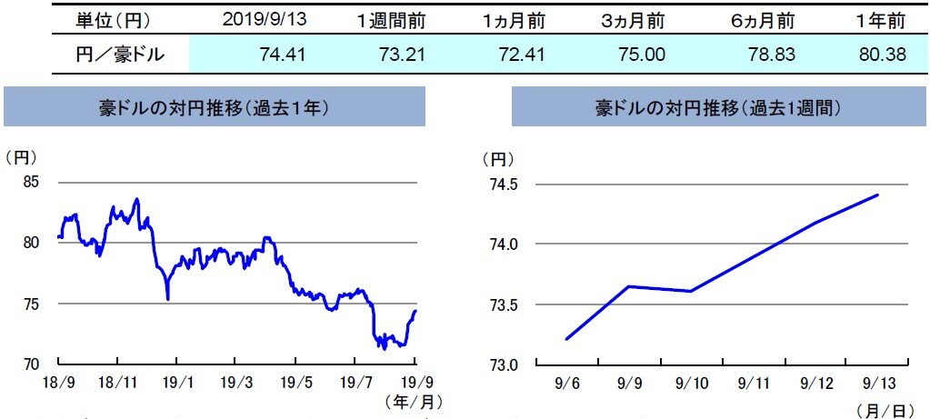 先週の豪ドルの対円レートは、上昇しました。先週は、トランプ米大統領が10月1日に予定していた対中追加関税の引き上げを15日まで先送りすると表明したことや、中国政府が米国産農産物の輸入再開を検討中と報道されたことなどから、豪ドルの対円レートは上昇しました。