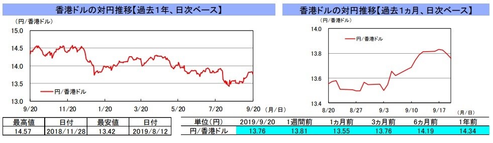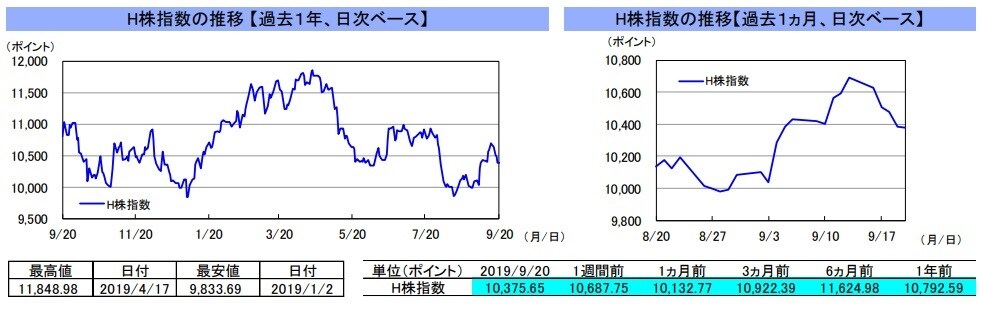 先週の中国本土市場は、上海総合指数が前週末比▲0.8%、深セン総合指数が▲0.3%と下落しました。先週は、16日に発表された8月の経済指標が低調な結果となったことや、中国人民銀行が17日の資金供給で、引き下げが期待されていた金利を据え置いたことなどを嫌気して、株価は下落しました。香港市場は、H株指数が前週末比▲2.9%、レッドチップ指数が▲1.3%と下落しました。先週は、8月の弱い経済指標を受けて中国の景気減速懸念が高まったことや、香港政府の高官が、抗議デモの長期化などを背景に7-9月期の香港経済がマイナス成長となる恐れがあると発言したことなどを嫌気して、株価は下落しました。