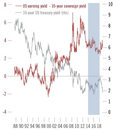 最近の実例といえば、米国10年国債利回りが2019年8月に3%程度から1.5%に下落したことがあげられます。同時に、株式のリスクプレミアムは、3%台前半から4%以上まで上昇しました。一言で言うと、低い利回りはクッションの役割をはたして、バリュエーションの平均が急上昇する必要がなく、株式が債券に対して魅力を増すことが可能となります。