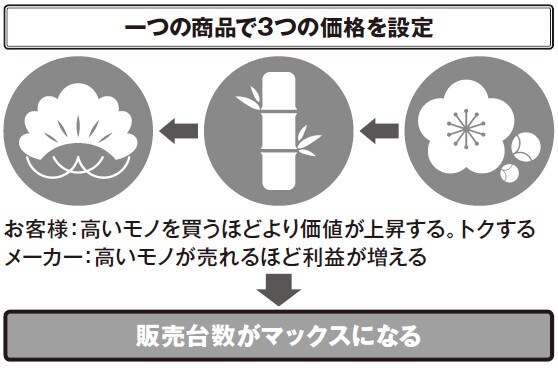 私が常々言っているのは、「一つの商品で3つのタイプを作れ」ということです。松竹梅を設定して、真ん中の商品が最も売れるようにするのです。これが販売台数のトータルを最大にする法則です。