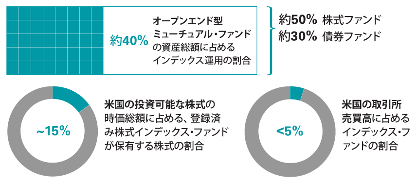 現在、米国のミューチュアル・ファンドに占めるインデックス運用の割合は40%に満たず、多くの投資家がポートフォリオの手数料を払い過ぎている可能性があります。また、米国株式市場の時価総額に占めるインデックス・ファンドの割合はわずか15%です。さらに、インデックス・ファンドは典型的な長期保有投資であるにもかかわらず、米国の証券取引所の売買高の5%にも達していません。したがって、インデックス運用は一般的に考えられているほど大規模とは言えません。