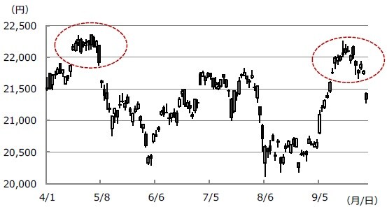 また、海外投資家は、9月第1週から第3週(9月2日~20日)まで、先物(日経225先物とTOPIX先物合計)を約2兆円買い越した一方、現物(東証・名証1・2部等合計)を2,400億円売り越しました。9月の株高は先物主導であることは明らかですが、これも持続性に乏しい傾向があります。そのため、米経済指標の悪化などで、海外投資家が先物売りに転じ、日経平均株価に売り圧力が強まる展開は十分に想定されます。