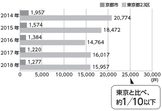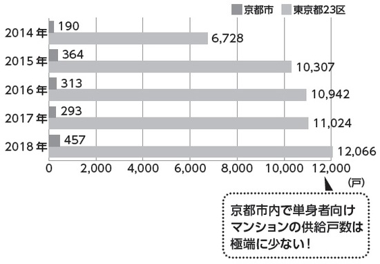 面積40㎡以下のいわゆる単身者向けのマンションでは、東京は2018年で約1万2000戸の供給があったのに対して、京都市は約26分の1の457戸です。東京23区と比較すると、京都市の供給量は際立って少ないことが分かります。