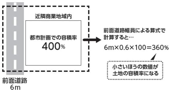 例)前面道路が6m、商業地域の場合→6×6/10=36/10(360%)