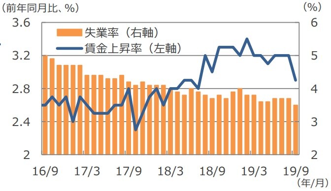■9月の賃金は前年同月比2.9%増と前月から伸び率が鈍化しました。前月比は▲0.04%減でした。失業率は3.5%と、1969年12月以来、約50年ぶりとなる低水準に低下しましたが、企業業績が悪化する中で、企業の雇用抑制や賃金引き上げの先送りなどから、賃金の伸びは緩やかに鈍化する可能性があります。