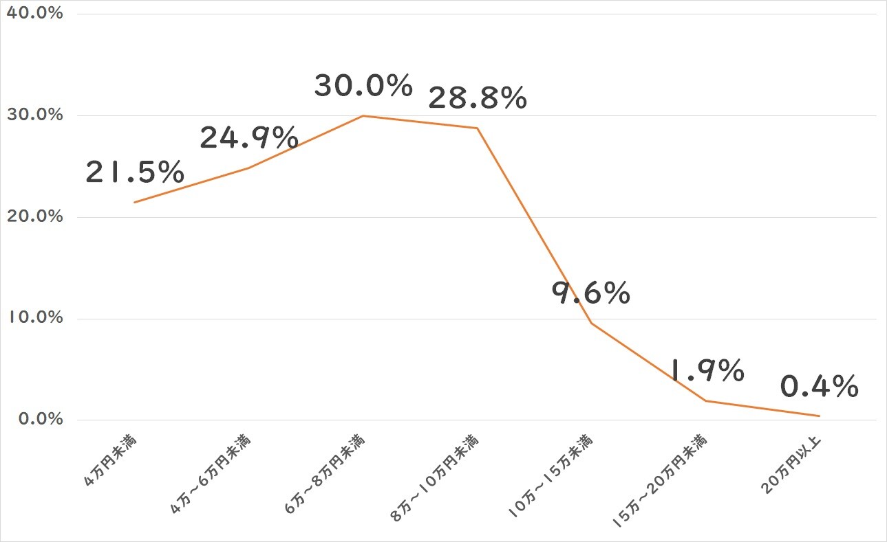 続いて、賃貸住宅事情と居住者の属性について見てみよう。西宮における家賃の分布(図表5)を見てみると、6~8万円がボリュームゾーン、その次に8~10万円、4~6万円と続く。単身者用物件と推測される金額帯で半数を超えることから、西宮において、単身者は賃貸経営の重要なターゲットになると考えられる。