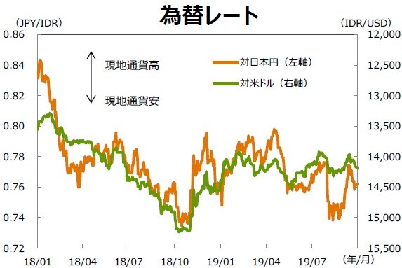 中銀は9月19日の金融政策決定会合で市場予想通り政策金利を5.50%から5.25%へ引き下げた。中銀は追加利下げの可能性を排除しておらず、国債利回りの低下傾向が続きそうだ。インドネシア国債の外国人保有比率は約40%と高く、国債利回りが低下(債券価格が上昇)する局面では、ルピアの対米ドルレートは上昇しやすい。