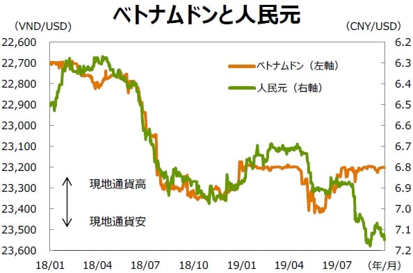従来、中国人民元との相関が高かったベトナムドンだが、8月以降の人民元安に追随することなく、安定的に推移している。低インフレ、経常収支黒字などベトナムドンが評価される要因が多く、ベトナムへの資金流入が継続している。人民元の動向には注意が必要だが、経常収支黒字、低いインフレ率、比較的高い経済成長率など、ベトナムの良好なファンダメンタルズがドンの安定性に寄与する動きが続くと予想する。