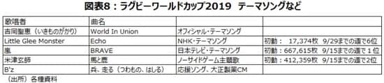 また、ラグビーワールドカップ関連のCDも売れている。9月29日現在、日本テレビ系列応援歌・嵐の「BRAVE」は69万枚、7~9月期に放映されたラグビー部を舞台にしたドラマ「ノーサイド・ゲーム」の主題歌、米津玄師の「馬と鹿」は45万枚とヒットしている(図表8)。日本代表が悲願の決勝トーナメント進出を果たせれば、国民的な明るい話題が、足元の心理面からの過度な悲観論を打ち消す可能性があろう。