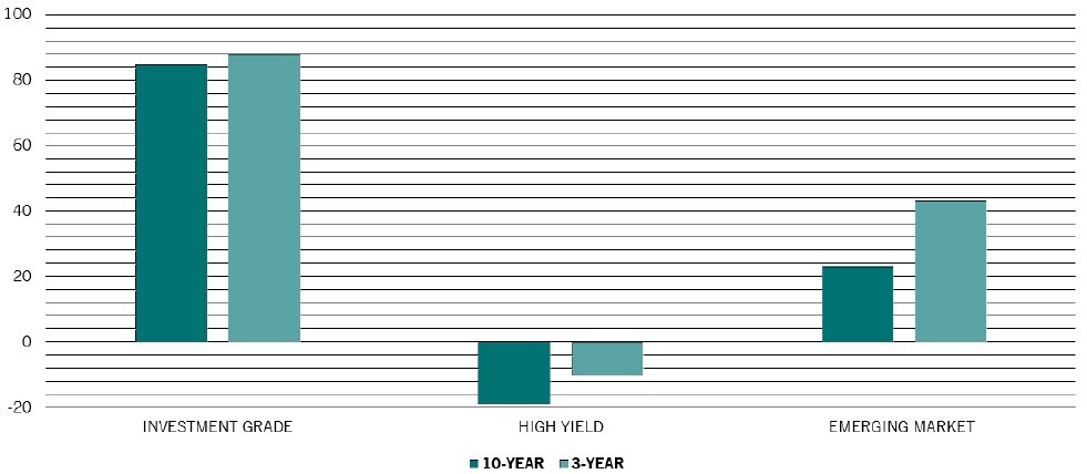 米国国債に対する投資適格および非投資適格社債、ならびに米ドル建て新興国債券の相関係数は、過去10年間と比較すると過去3年間は高くなっています(図表1参照)。
