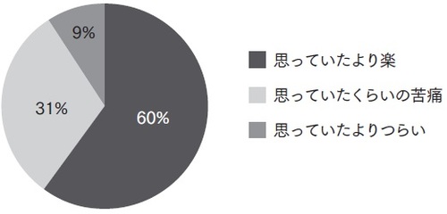実際、私の病院のアンケートでも、半数以上の方が「苦痛はなかった」と答えていますし、初めて胃カメラを経験した患者さんでは、「思っていたより楽」と答えた人が60%を占めています。「思っていたくらいの苦痛」は31%、「思っていたよりつらい」が9%です。さすがに「苦痛がゼロ」とは言えませんが「そこまでつらいものではないですよ」とは言っておきたいところです。