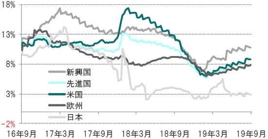 9月のグローバル株式市場は、利益成長を確保したバリュー銘柄をけん引役に、上昇しました。景気拡大期の最終局面で、バリュー株のリターンがグロース株を上回ることは歴史が実証しています。バリュー株は2008年以降、グロース株に大きく出遅れてきましたが、世界の貿易量の一貫した縮小基調と足元の米国国債利回りの急騰が、投資家に(景気の変動に左右されにくい)ディフェンシブ銘柄への入れ替えを促したものと思われます。MSCI全世界バリュー株価指数の月間騰落率はドルベースで3.5%強となり、同グロース株価指数を3%程度、上回りました。