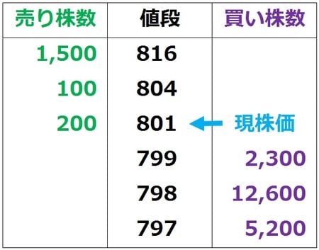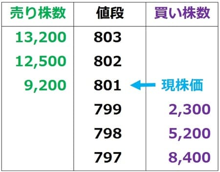 板(いた)情報とは、売買注文がどう入っているか示すものです。上記のA社では、801円に9,200株、802円に12,500株、803円に13,200株の売り指値注文が入っています。また、799円に2,300株、798円に5,200株、797円に8,400株の買い指値注文が入っています。
